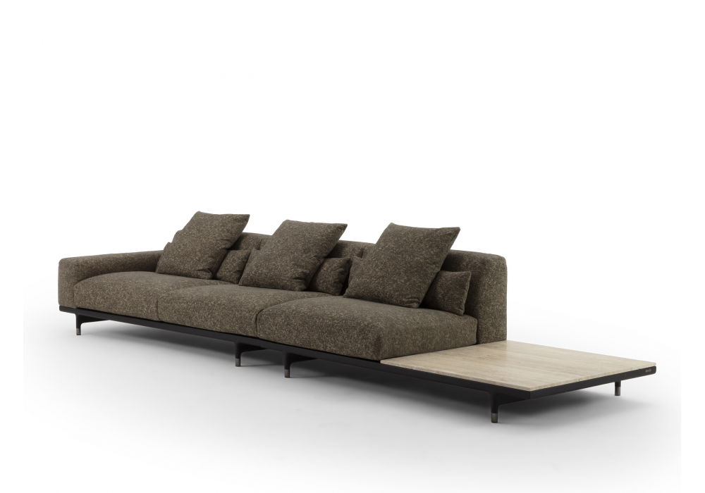 Argo XL von D. Dolcini für Porada entworfen, ist ein modulares Sitzsystem mit einem massiven Sockel aus Canaletta-Nussbaumholz und Endkappen aus schwarzem Chrom oder gebürstetem Messing. Die Sitze ruhen auf elastischen Sperrholzplatten und sind mit Polyurethanschaum unterschiedlicher Dichte und einer Memory-Schaum-Oberschicht gepolstert. Rückenlehnen und Armlehnen bestehen aus einer Sperrholzkonstruktion mit spezieller Polsterung. Der Stoffbezug ist abnehmbar, der Lederbezug hingegen fest. Optional erhältlich sind Lendenkissen mit Gänsedaunenfüllung sowie integrierte Elemente wie Aufbewahrungsschränke aus Canaletta-Nussbaum mit verschiebbaren Holz- und Rauchglasböden und Couchtische mit Marmorplatten.