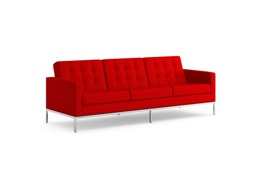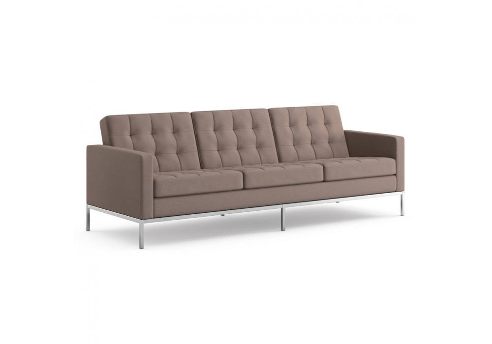 Florence von Florence Knoll für Knoll entworfen ist ein 3-Sitzer-Sofa mit einem Vierkantrohrrahmen aus Stahl mit polierter oder lackierter Chromoberfläche. Die Sitz- und Rückenkissen enthalten geformten Schaumstoff in verschiedenen Dichten und sind mit Polyesterfasern gefüttert, um den Komfort zu erhöhen. Die Kissen sind mit einer Steppnaht versehen. Die Sitz- und Rückenkissen aus Leder haben gesteppte Quadrate mit Knöpfen, während die Kissen aus Stoff gesteppte Quadrate ohne Knöpfe haben. Bezug aus Stoff oder Leder.