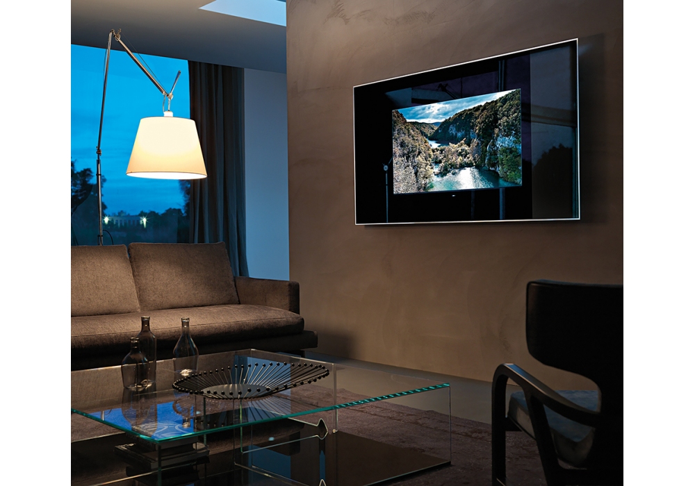 Mirage TV von Daniel Libeskind für Fiam entworfen, ist ein Wand-Spiegel mit TV-Gehäuse aus titanfarbenem, halbreflektierendem Glas mit einem rückseitigen Rahmen aus Aluminium in Brillantoptik. Mattschwarz lackierter Metallrahmen.