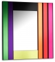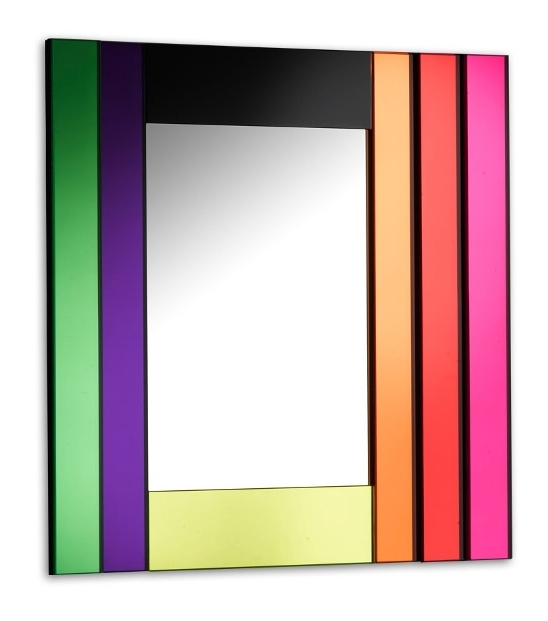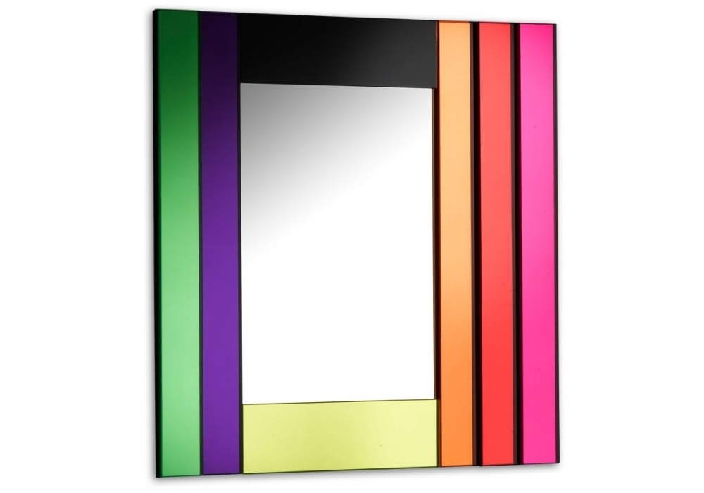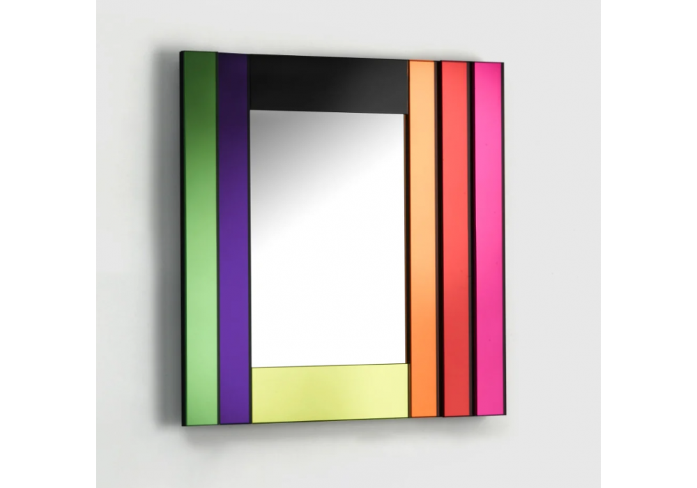 Dioniso 3 von Ettore Sottass für Glas Italia entworfen, ist ein Spiegel aus einer Kollektion von 6 Wandspiegeln in verschiedenen Formen und Größen. Er zeichnet sich durch polychrome Rahmen aus, die aus Elementen aus farbigem Verbundspiegel, farbigem Verbundglas und lackiertem Glas bestehen.