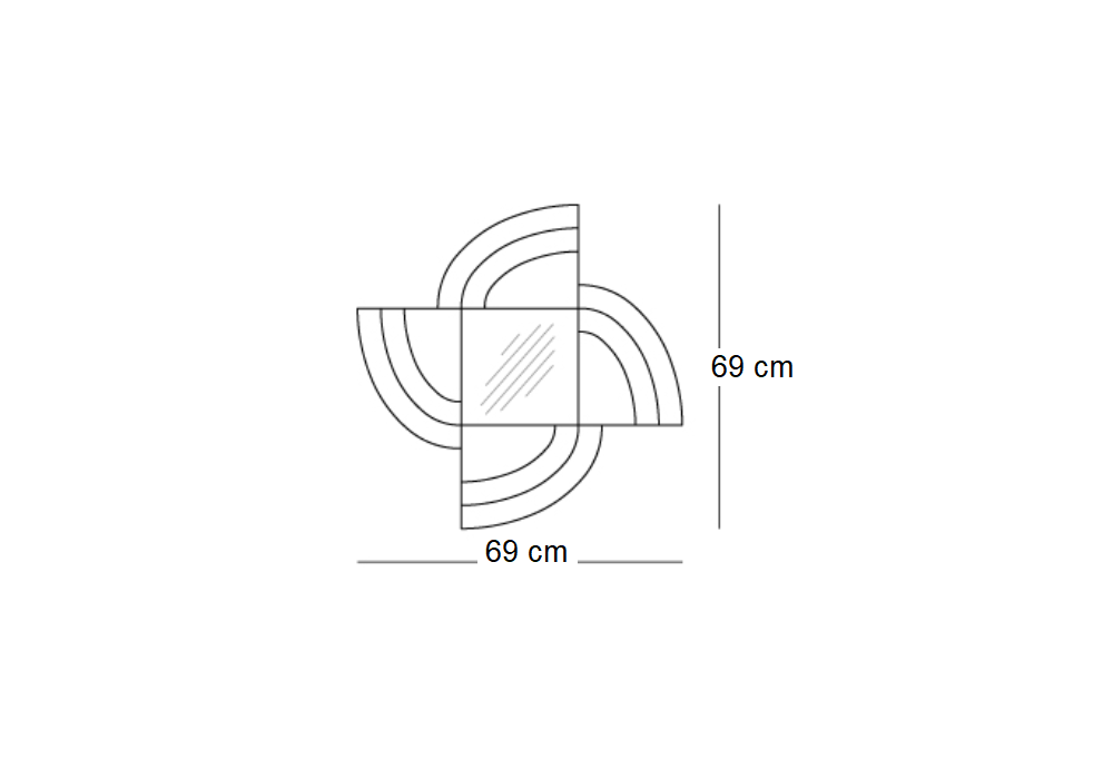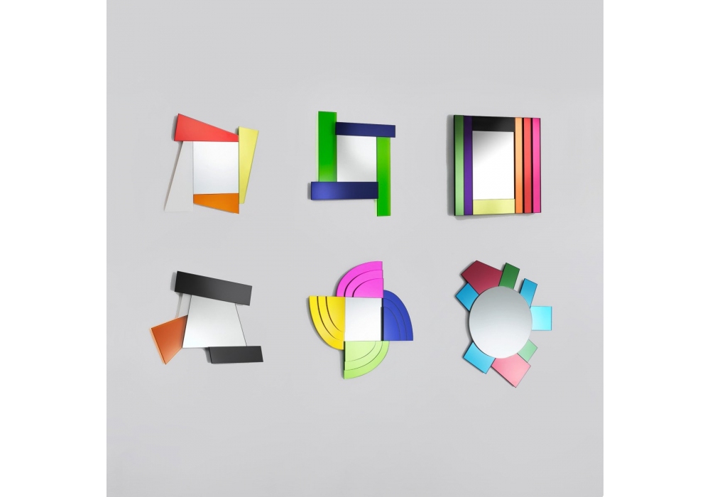 Dioniso 5 von Ettore Sottass für Glas Italia entworfen, ist ein Spiegel aus einer Kollektion von 6 Wandspiegeln in verschiedenen Formen und Größen. Er zeichnet sich durch polychrome Rahmen aus, die aus Elementen aus farbigem Verbundspiegel, farbigem Verbundglas und lackiertem Glas bestehen.
