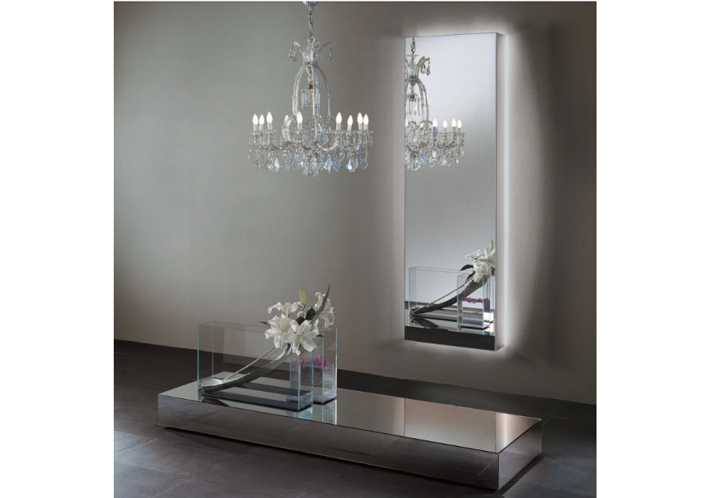 I Massi 01/03, unterzeichnet von Claudio Silvestrin, handelt es sich um einen Spiegel, der in zwei Ausführungen erhältlich ist, mit oder ohne Lichtanlage. Weisses Neon tritt aus der Rückseite des Spiegels heraus und wird durch das Verkleben von 45° übereinander gelegten Platten zu einem monolithischen Look.