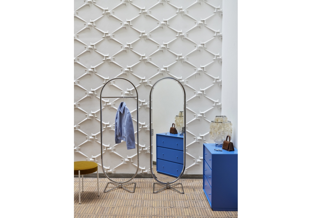 System 1-2-3 von Verner Panton für Verpan entworfen, ist ein Spiegel, der auf einer ovalen Struktur aus verchromtem Stahl mit einem doppelseitigen 4-mm-Spiegel montiert ist. Basis aus verchromtem Stahl in Schmetterlingsform. Es lässt sich um 360° neigen und drehen.
