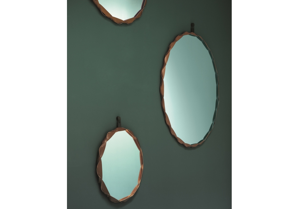 471 Raperonzolo von Atelier Oï für Zanotta entworfen, ist ein Spiegel mit Kontur aus Rindsleder im Goldton, verwoben mit Alcantara® in den Farben Gold, Blau und Violett. Wandbefestigung mittels bronzierter Metallplatte.