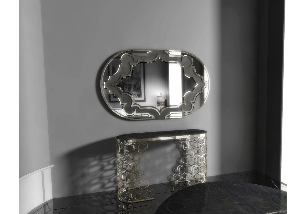 Byron von Giuseppe Iasparra für Longhi entworfen, ist ein Spiegel mit Struktur aus glänzendem oder matt geschliffenem Metall und Innenkante und Dekoration mit Gämsenkatze bezogen. Wildleder. Verfügbar in verschiedenen Ausführungen.