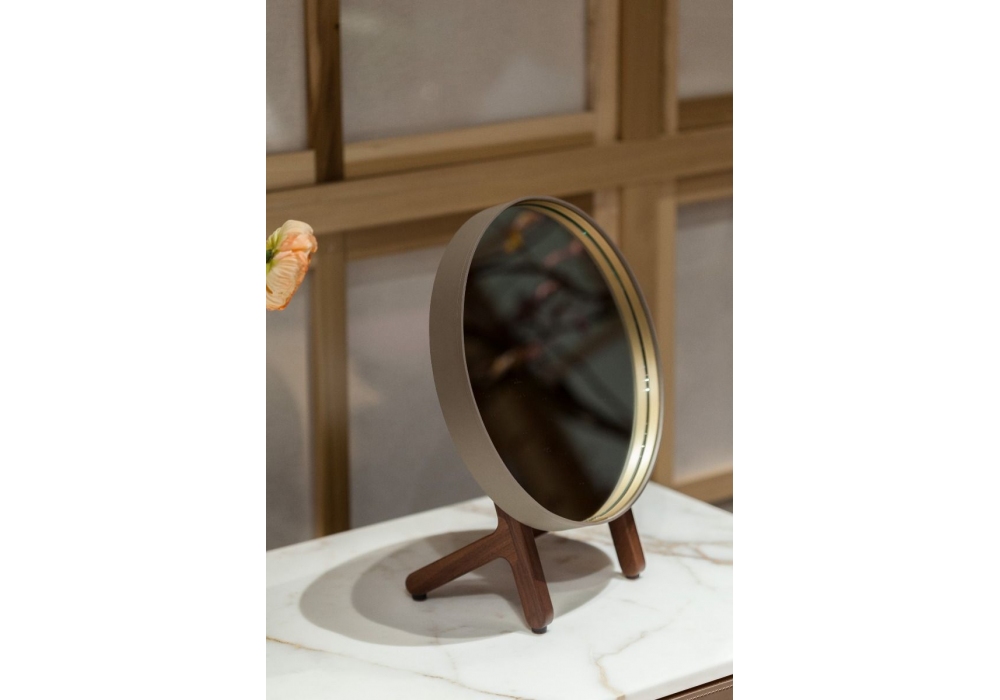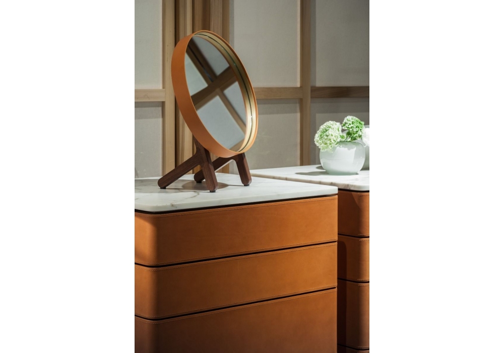 Der Tischspiegel Ren von Neri & Hu für Poltrona Frau entworfen, besteht aus einer runden Fläche (Durchmesser 31 cm), gestützt von zwei seitlichen Streben und zwei Querträgern. Der Rahmen, der den Spiegel umschließt, ist mit Cuoio Saddle Extra®-Leder bezogen und auf der Innenseite mit einem Streifen aus Messing veredelt.