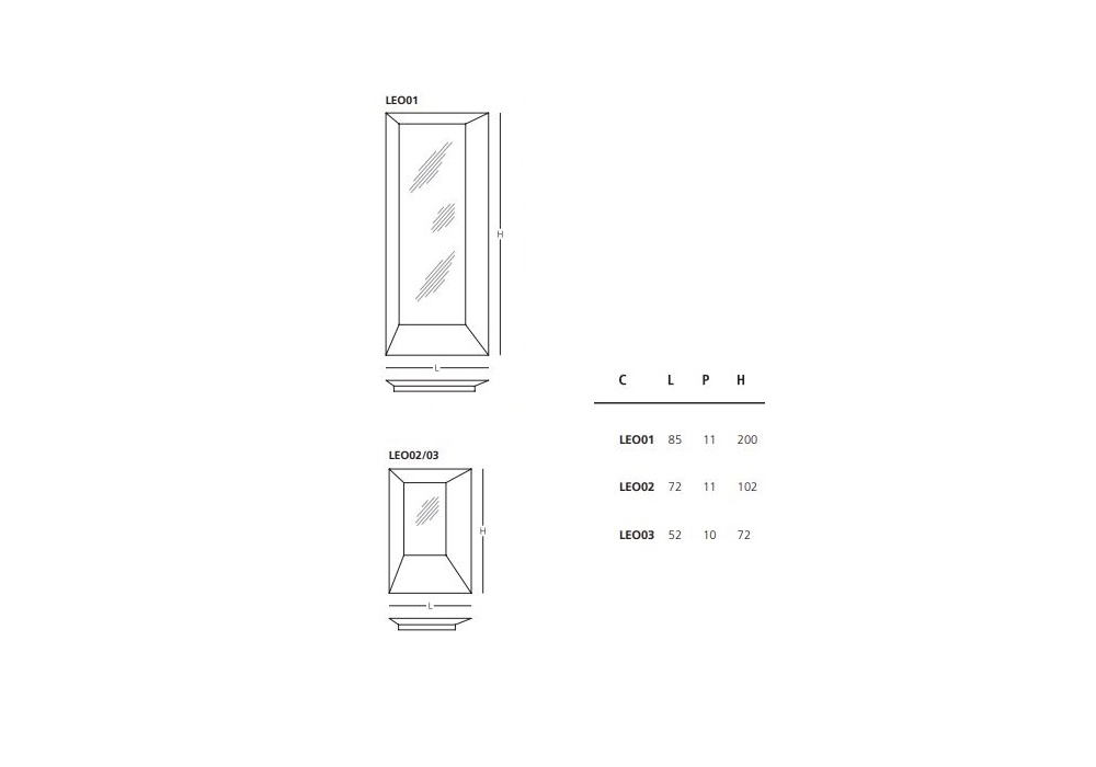 Leon Battista von Laudani & Romanelli für Glas Italia entworfen, ist ein Spiegel in Form eines perspektivischen Hintergrunds, erhältlich in drei verschiedenen Größen. Der zusammenlaufende Rahmen ist verspiegelt und hat alle Seiten mit unterschiedlichen Breiten und Neigungen.