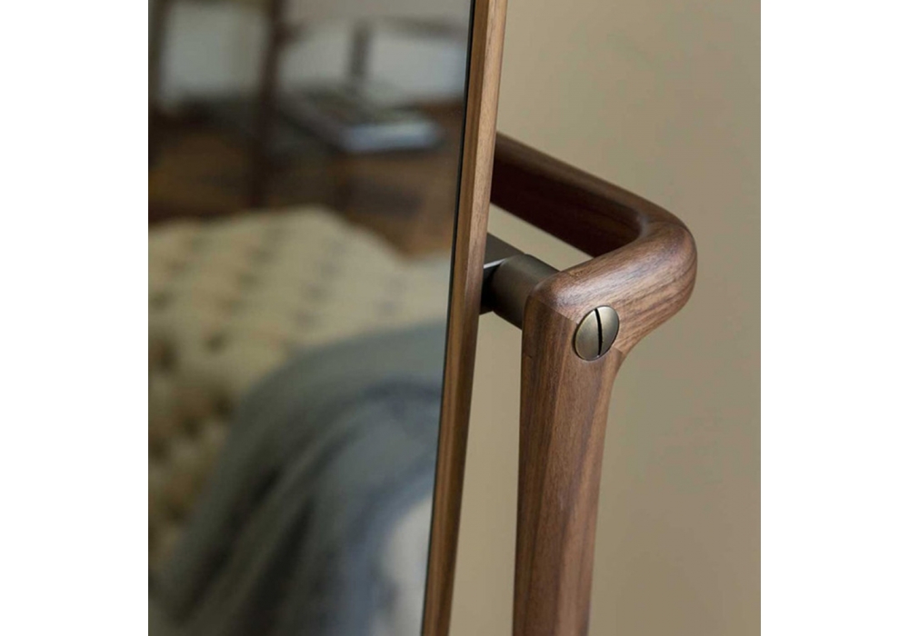 Timothy, von Carlo Ballabio für Porada entworfen, ist ein freistehender Spiegel mit Rahmen aus massivem Nussbaum Canaletta verfügbar in 2 Ausführungen, und Einzelheiten aus bronzierten Messig. Man kann den Spiegel verschiedene Positionen kippen.