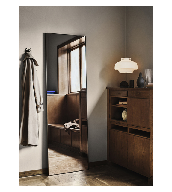 Amore von Space Copenhagen für &Tradition entworfen, ist ein Spiegel mit bronzierter Messingstruktur, silberfarbenem Spiegel und Textilträger. Verfügbar in mehreren Abmessungen.
