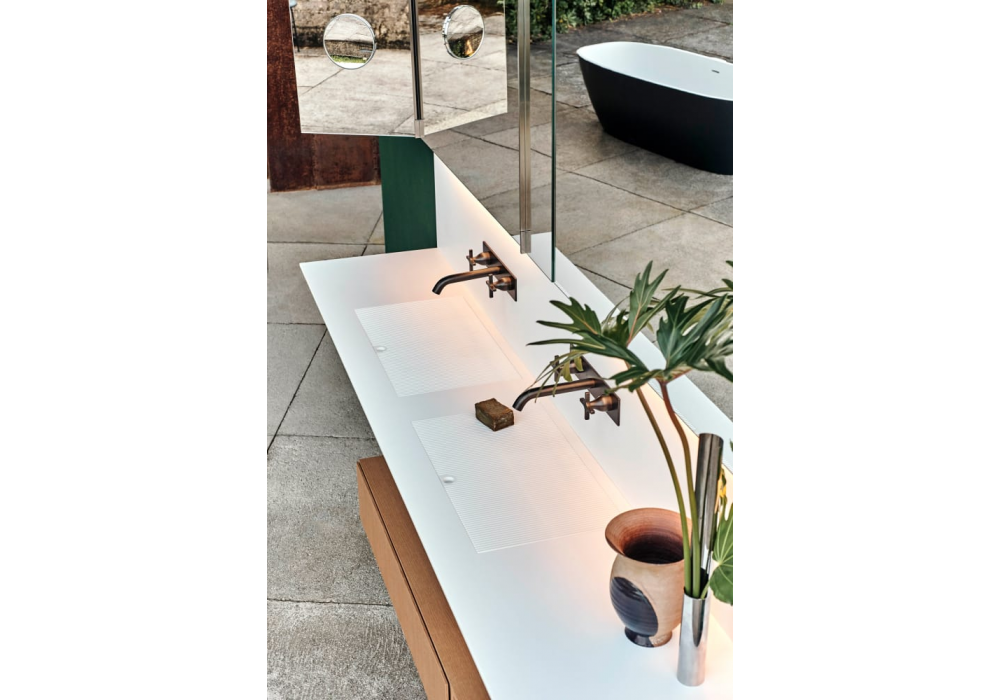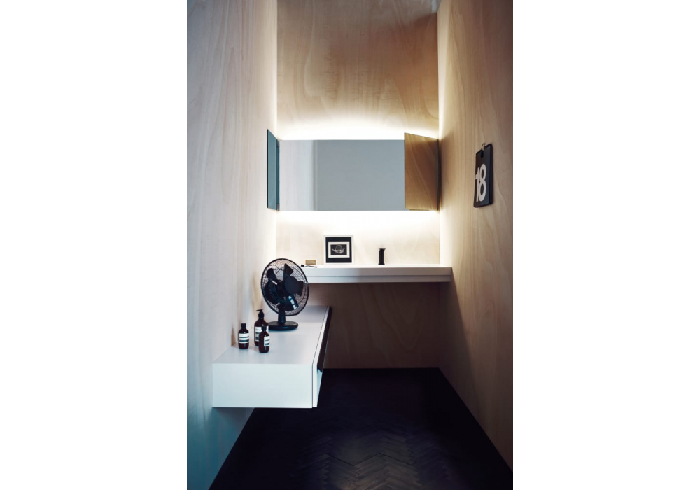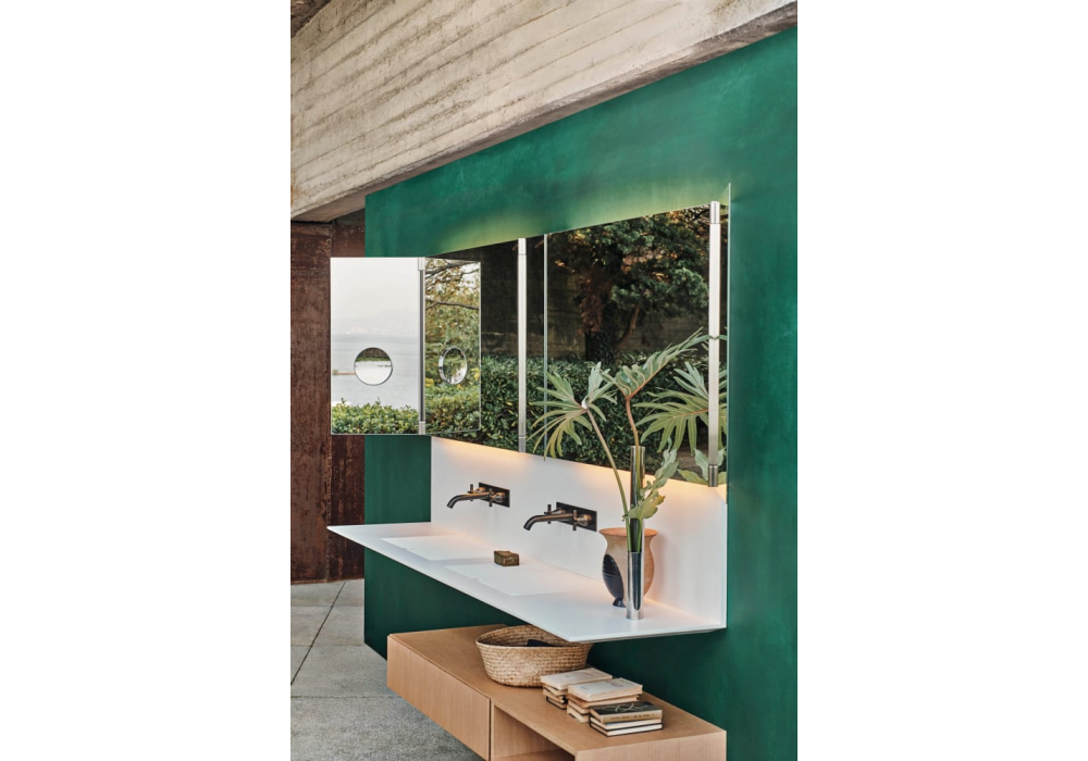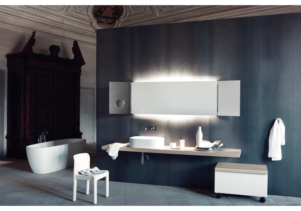 Narciso, von Benedini Associati für Agape entworfen, ist einer Spiegel Rechteckiger, komponierbarer Spiegel mit sichtbaren Scharnieren aus glänzendem Edelsthal.. In drei Elemente mit glänzendem Rand und Sicherheitsfolie unterteilt. Mittleres Element in Standardoder Spezialmaßen, beidseitig verspiegelte Seitenflügel in zwei Breiten, 20 cm oder 40 cm. In dem Versionen von 60 oder 80cm Höhe ist das Mittelteil auch mit oben und unten hinter dem Spiegel montierten LED Lichtern lieferbar.