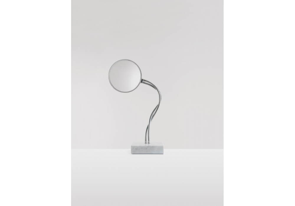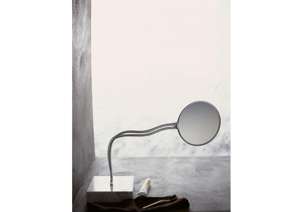 Fusilli von Benedini Associati für Agape entworfen, ist ein doppelseitiger runder Spiegel mit einer Vergrößerungsseite, der von flexiblen Rohren getragen wird. Die Struktur besteht aus verchromtem Messing. Er kann an der Wand oder auf einer Oberfläche verwendet werden und ist auch in einer freistehenden Version mit einem Sockel aus weißem Carrara-Marmor erhältlich.