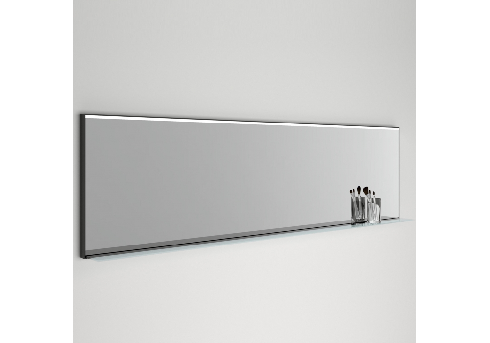 Led Line, von C.R.S. Boffi entworfen, ist einer maßgefertigter Wandspiegel mit LED-Beleuchtung. Rahmen in natur eloxiert, mattweiß oder mattschwarz lackiert. Erhältlich in der horizontalen Version mit Regal und LED-Leiste oder ohne Regal mit Beleuchtung auf der oberen oder laterale Seite.