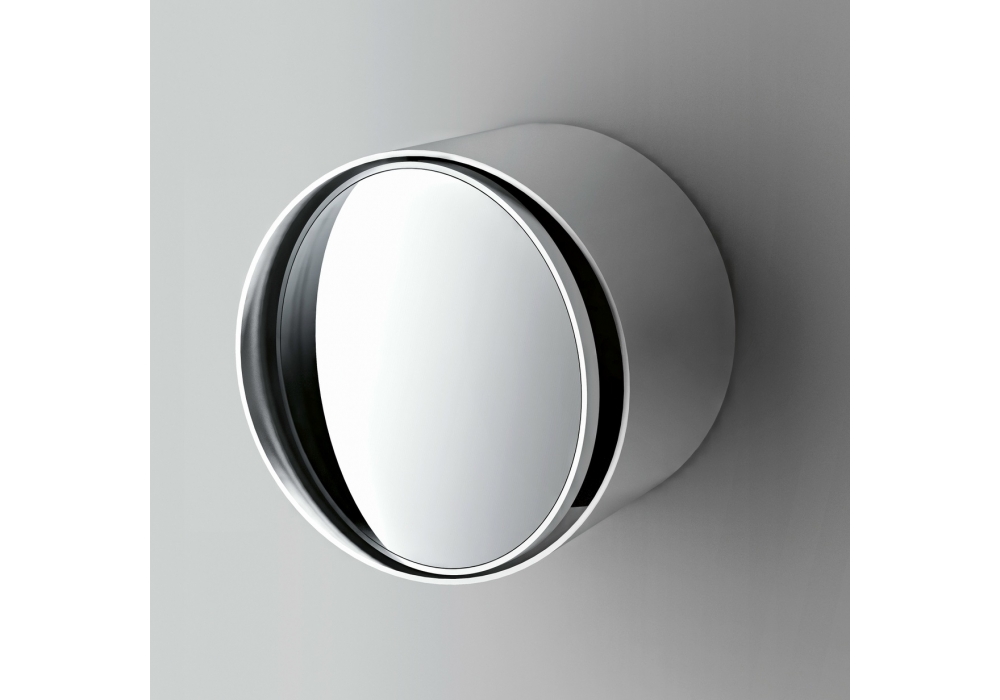 Index, von Felicia Ferrone für Boffi entworfen, ist einer Wandspiegel mit zylindrischer Struktur aus gebürstetem Edelstahl. Es hat einen rotierenden Träger, auf dem zwei Spiegel mit unterschiedlichen Eigenschaften montiert sind.