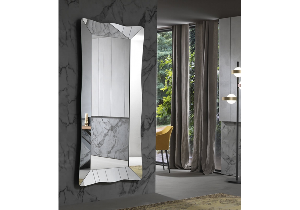 Nausica von Riflessi entworfen, ist ein Spiegel mit einem geneigten, verspiegelten oder blattbedeckten Rahmen. Verfügbar in mehreren Ausführungen und Abmessungen.