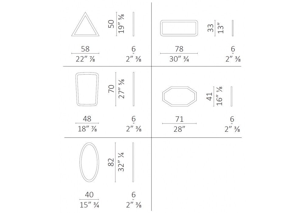 | Abmessungen | • 58 x 6 x H 50 cm; • 78 x 6 x H 33 cm; 48 x 6 x H 70 cm; • 71 x 6 x H 41 cm; • 40 x 6 x H 82 cm |