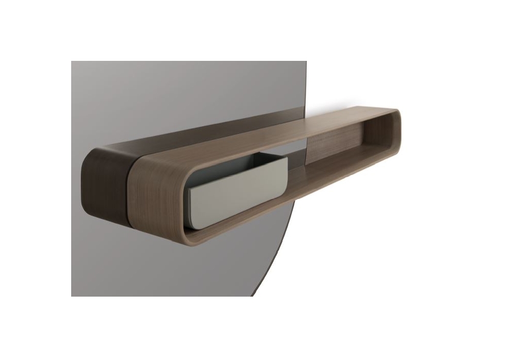 Uyuni, von M2Atelier für Giorgetti entworfen, ist ein Wandspiegel, in Rauchgrau-Finish, mit Struktur lackiert in Titan-Finish Liquid Metal-Effekt und Hängeregal aus massivem Nussbaum Canaletto, verfügbar in verschiedenen Ausführungen. Der Spiegel ist mit oder ohne integrierter Beleuchtung erhältlich: In der elektrifizierten Version beherbergt der hinterleuchtete Rahmen im Inneren eine LED-Quelle mit hoher Farbwiedergabe. Auf dem Regal befindet sich der Ein-Aus-Touch-Schalter.