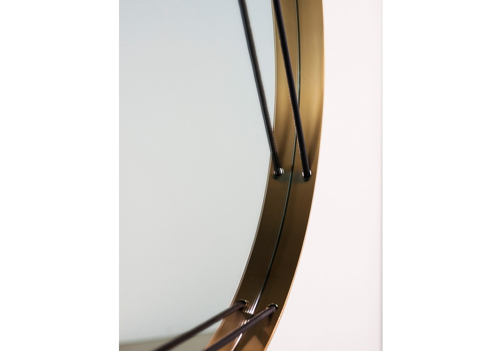 Soleil von Giorgio Bonaguro für Tacchini entworfen, ist ein Spiegel mit verchromtem Metallrahmen, mit dunkelbrauner Lederkordel. Spiegel mit Holzboden.