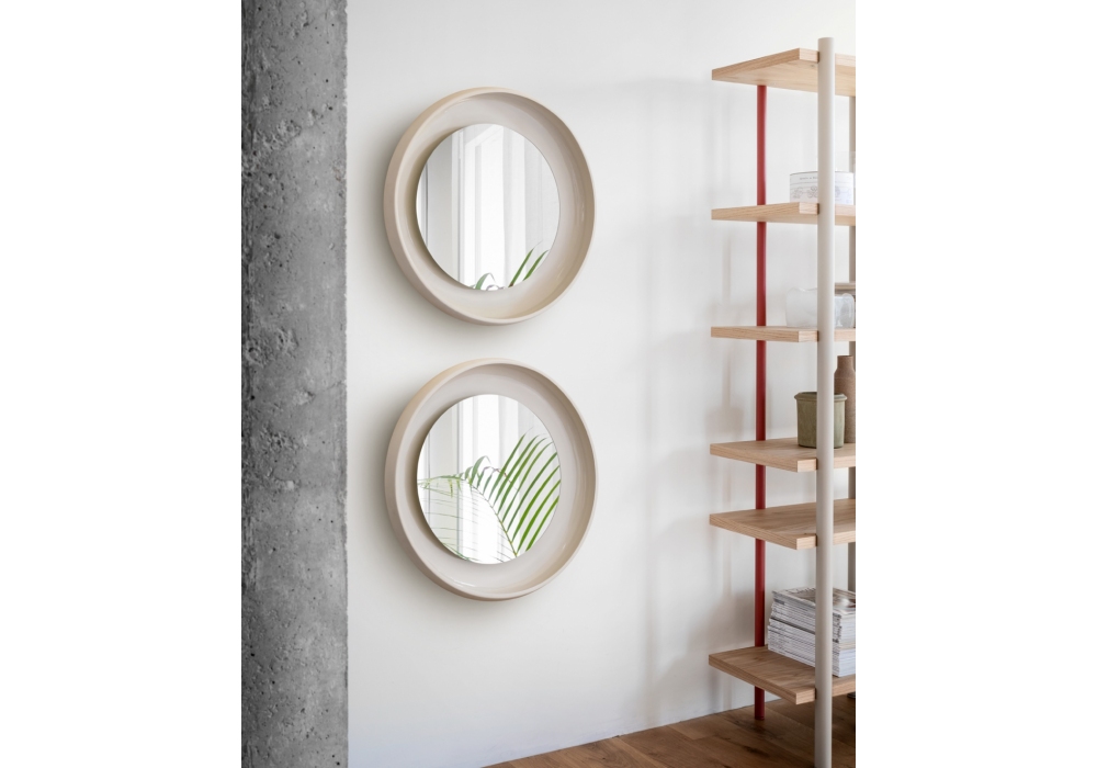 Coque, von Alain Gilles für Miniforms entworfen, ist ein runder Spiegel mit Innenrahmen aus glasierter Keramik und Außenrahmen aus matter Keramik. Es ist in zwei Größen und in verschiedenen Ausführungen erhältlich.