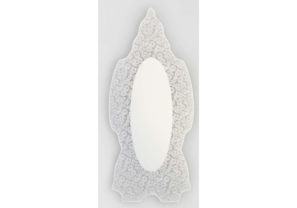 Spizzo, von Cinzia Ruggeri für Glas Italia entworfen, ist ein geformter Spiegel, der in zwei Größen erhältlich und mit einem zarten Einsatz aus verspiegelter Spitze verziert ist.