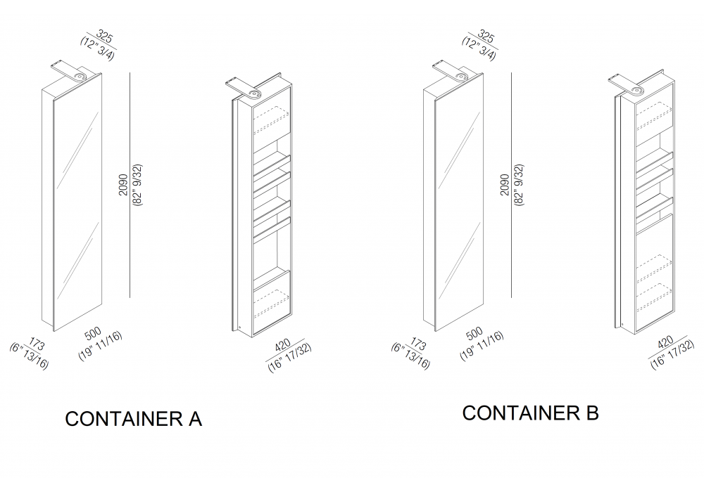 Voilà von Alessandro Andreucci für Agape entworfen, ist ein nach rechts oder links schwenkbarer Spiegelcontainer aus MDF mit Eichenverkleidung in verschiedenen Ausführungen. Eine Seite ist vollständig verspiegelt und die andere ist mit Containern, Regalen und Handtuchhaltern ausgestattet. Es ist auch möglich, eine elektrifizierte Leiste oder eine vertikale LED-Lichtleiste hinzuzufügen.