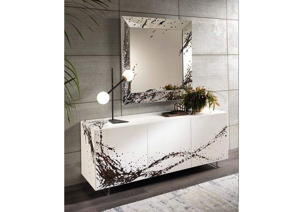 Trapezio Art von Riflessi entworfen, ist ein Spiegel mit geneigtem Rahmen sowohl in der verspiegelten als auch in der bronzierten verspiegelten Version und mit einer von Hand aus Epoxidharz gefertigten Dekoration verziert. Verfügbar in mehreren Abmessungen.