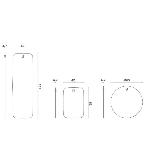 | Abmessungen | • 42 x 4,7 x H 62 cm; • Ø 65 cm x 4,7 cm; • 42 x 4,7 x H 132 cm |