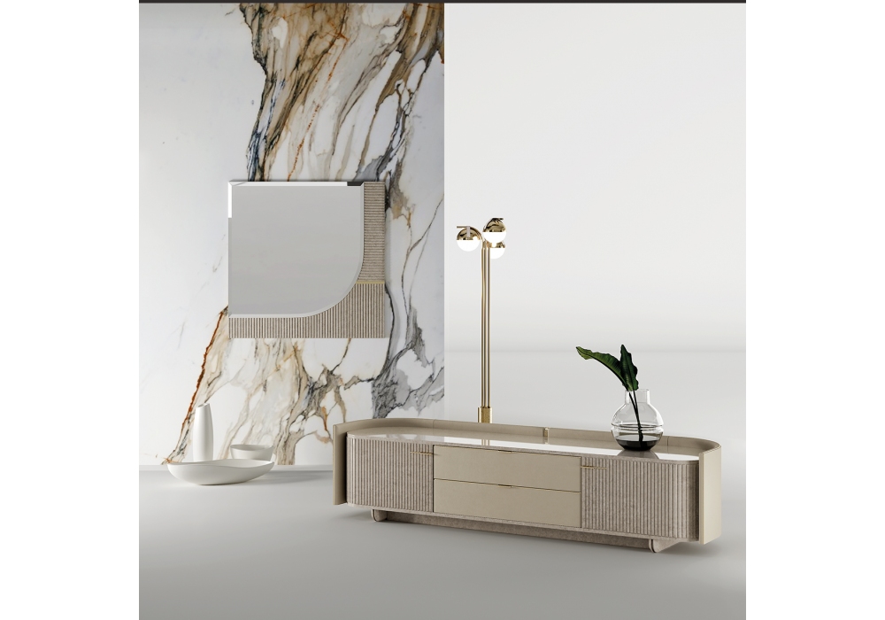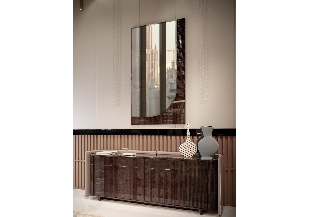 Eclipse von Andrea Bonini für Turri entworfen, ist ein Spiegel mit MDF-Struktur in glänzend lackierter Ausführung und dekorativen Pilastern. Goldene Metalldetails. Verfügbar in zwei Dimensionen.