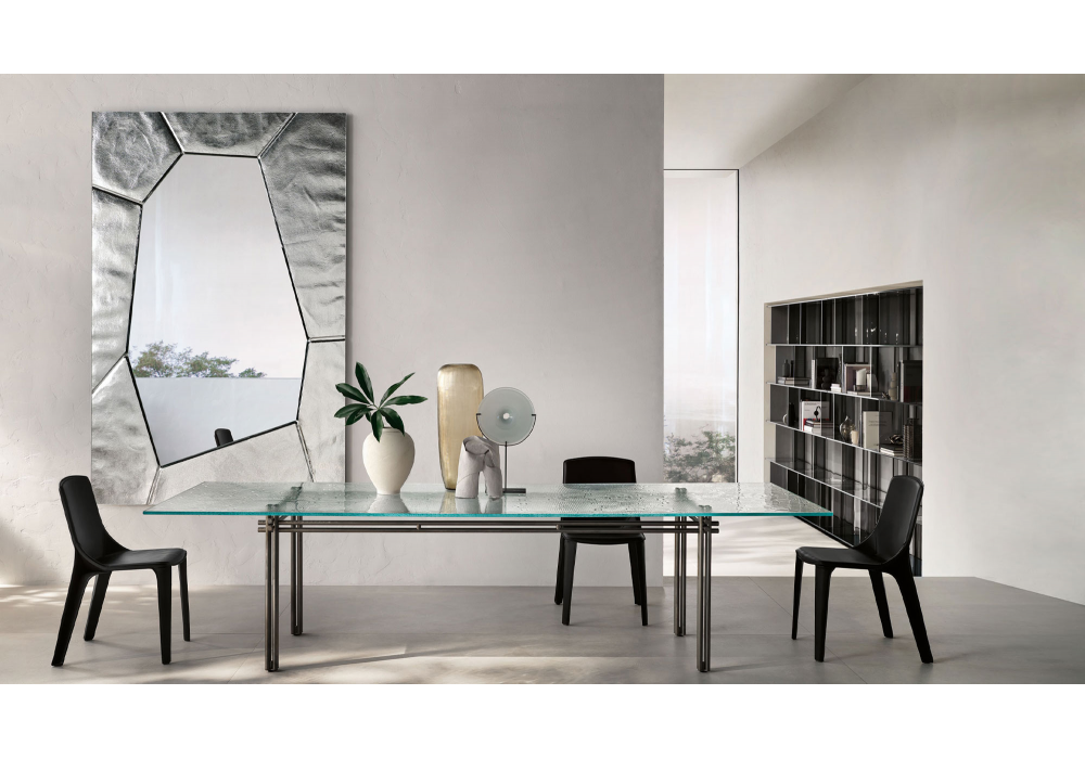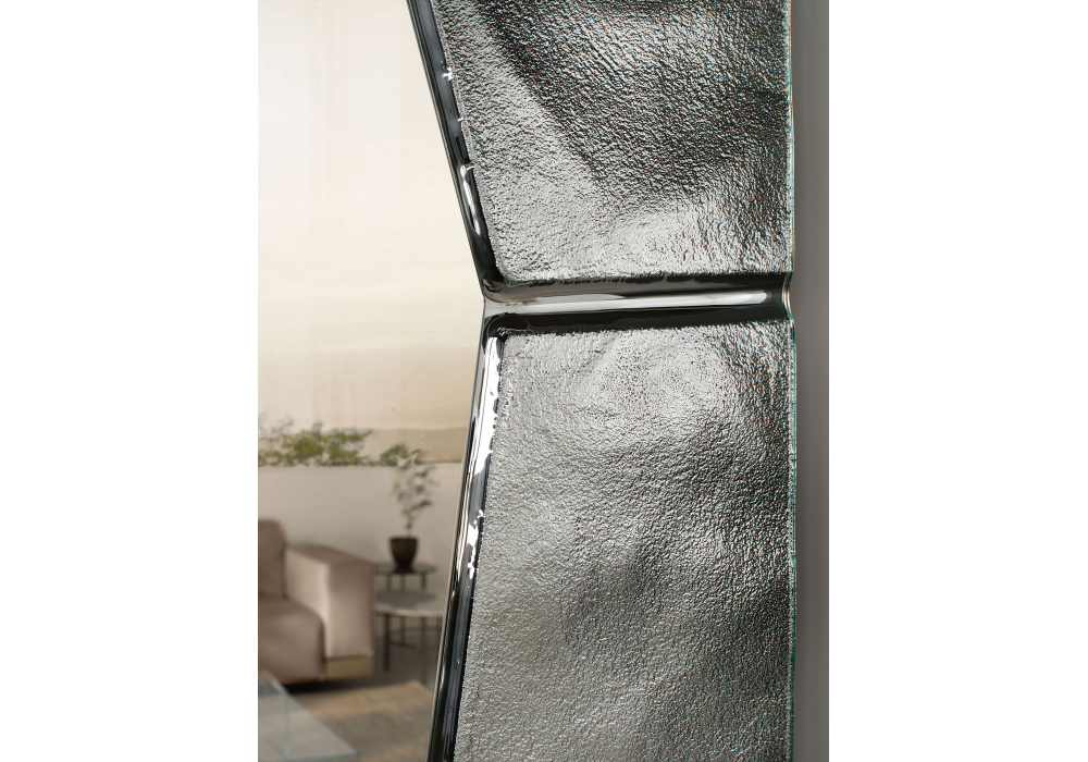 Silica von Arik Levy für Fiam entworfen, ist ein Wand- oder Bodenspiegel mit Rahmen aus versilbertem geschmolzenem Glas, dessen Textur durch eine handgefertigte Dekoration entsteht. Hinterer Rahmen aus lackiertem Metall. Möglichkeit der vertikalen oder horizontalen Aufhängung.