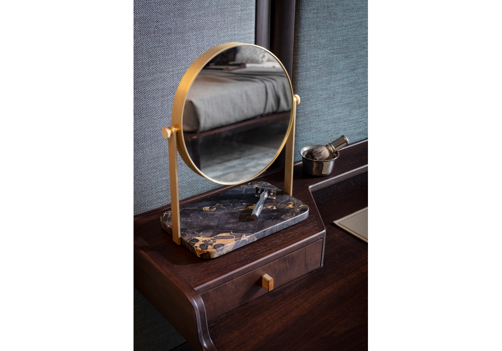 Regarde-moi, von Giuseppe Casarosa für Ceccotti Collezioni entworfen, ist ein drehbarer Tischspiegel mit Messingstruktur und Marmorsockel.