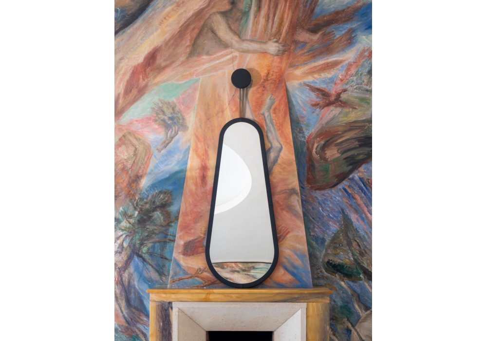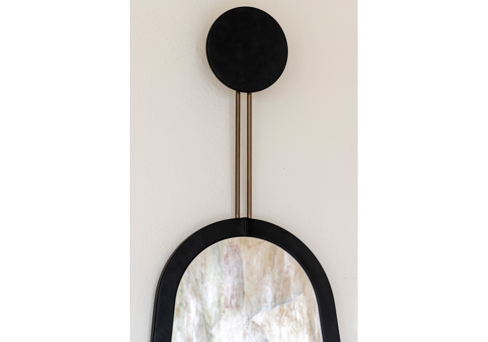 Spring von Serena Confalonieri für Potocco entworfen, ist ein Wand-spiegel mit Profil und kreisförmigem Befestigungselement, bezogen mit Leder in verschiedenen Ausführungen. Die beiden Metallstangen sind aus brüniertem Messing.