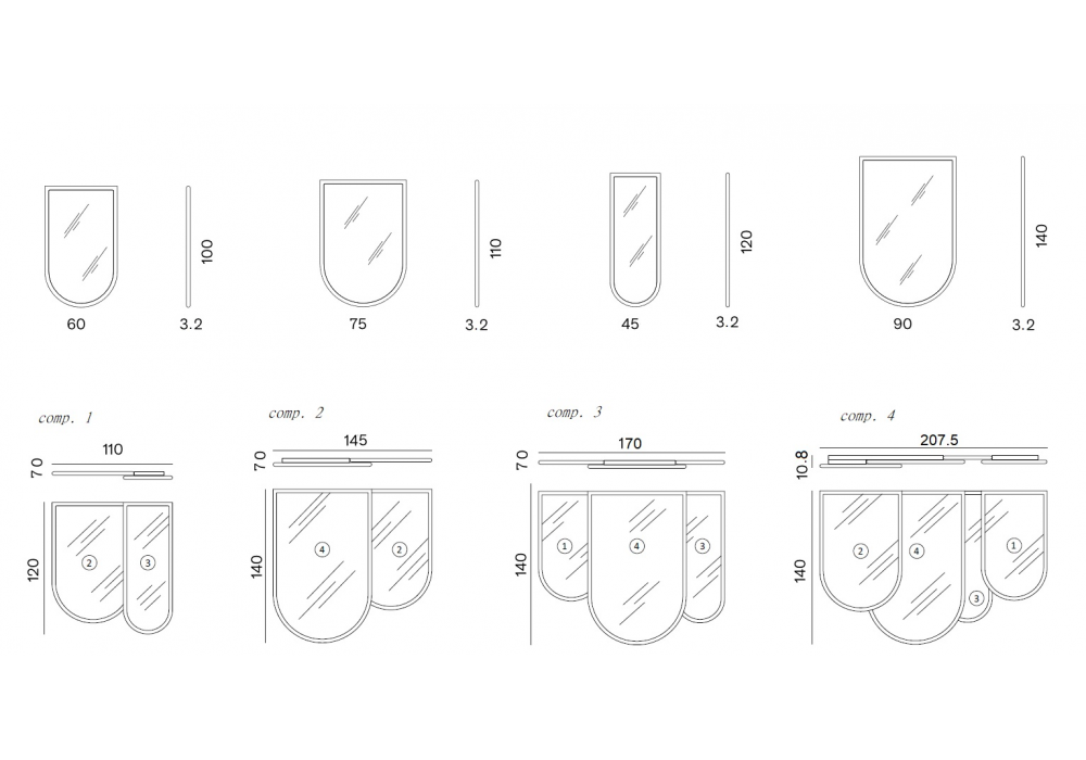 Grex signiert von Silvano Pierdonà für Capodoopera, ist ein Spiegel in einem Rahmen mit zylindrischem Abschnitt. Die Befestigung an der Wand erfolgt über eine serienmäßig angebrachte Platte, die im fertigen Zustand unsichtbar ist. Sie können zwischen drei verschiedenen Spiegeloberflächen wählen.
