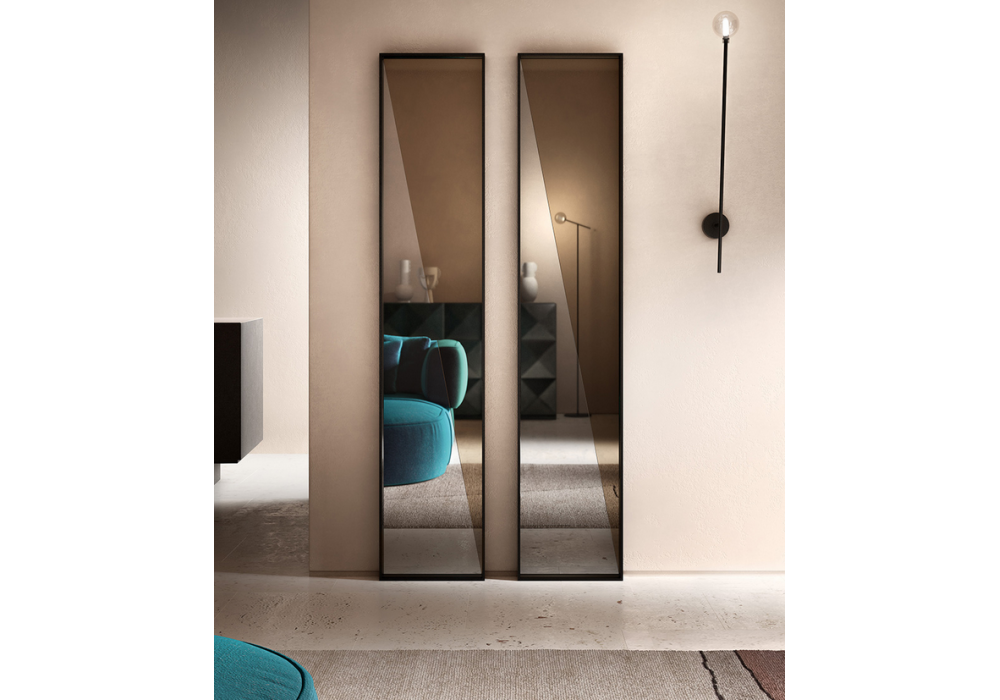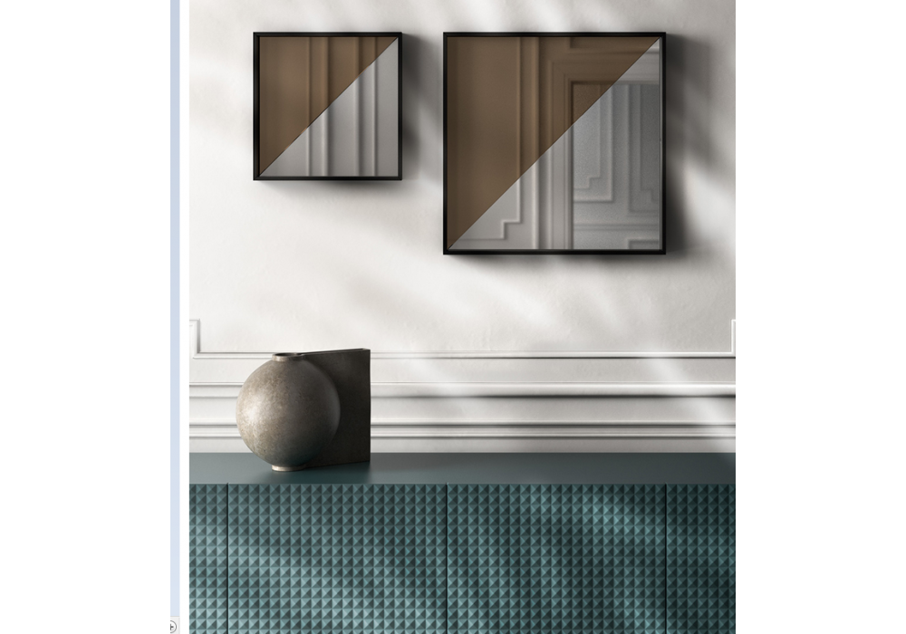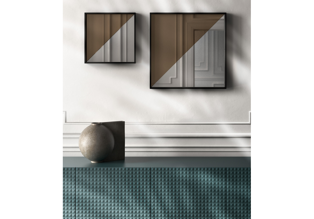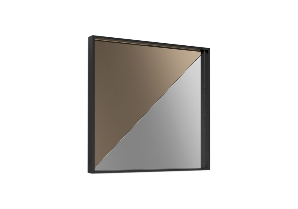Diagonal von Alessio Bassan für Capodopera entworfen, ist ein Spiegel, der aus der Kombination einer grauen reflektierenden Platte mit einer bronzefarbenen Platte besteht, diagonal geschnitten und in einen mattschwarz lackierten Rahmen eingesetzt wird.