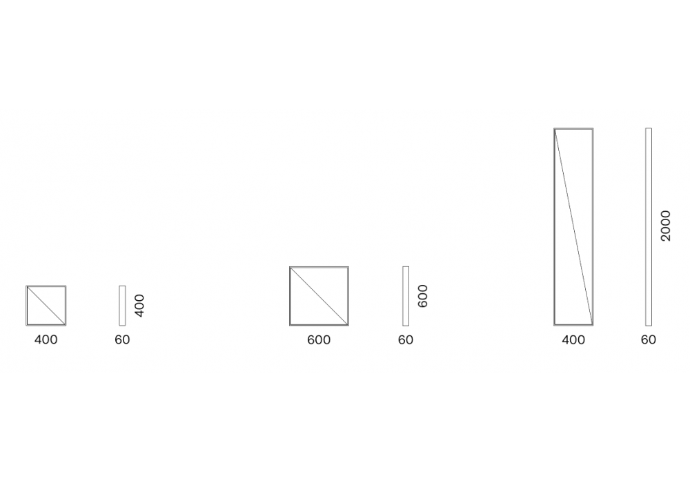 | Abmessungen | 40 x 6 x H 40 cm; 60 x 6 x H 60 cm; 40 x 6 x H 200 cm. |