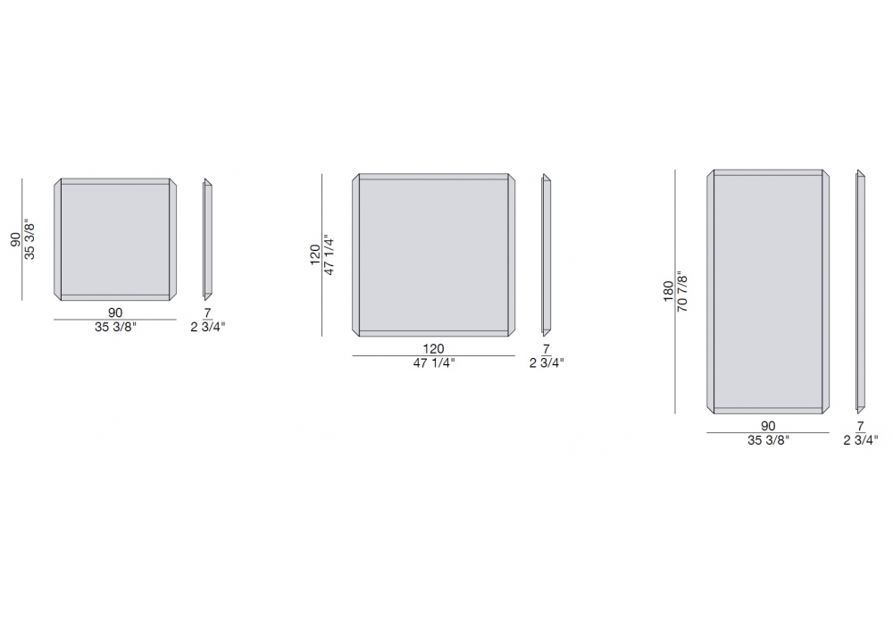 | Abmessungen | • 90 x 7 x H 90 cm; • 120 x 7 x H 120 cm; • 90 x 7 x H 180 cm |