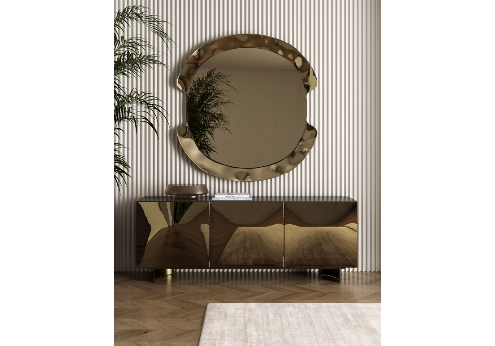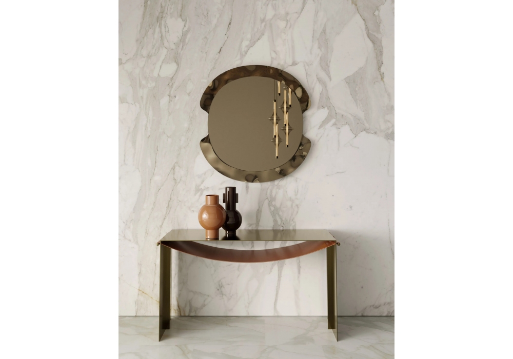 Peak von Luca Roccadadria für Bontempi entworfen, ist ein geformter Spiegel mit einem strukturierten Rahmen in Rauch- oder Bronzeoptik.