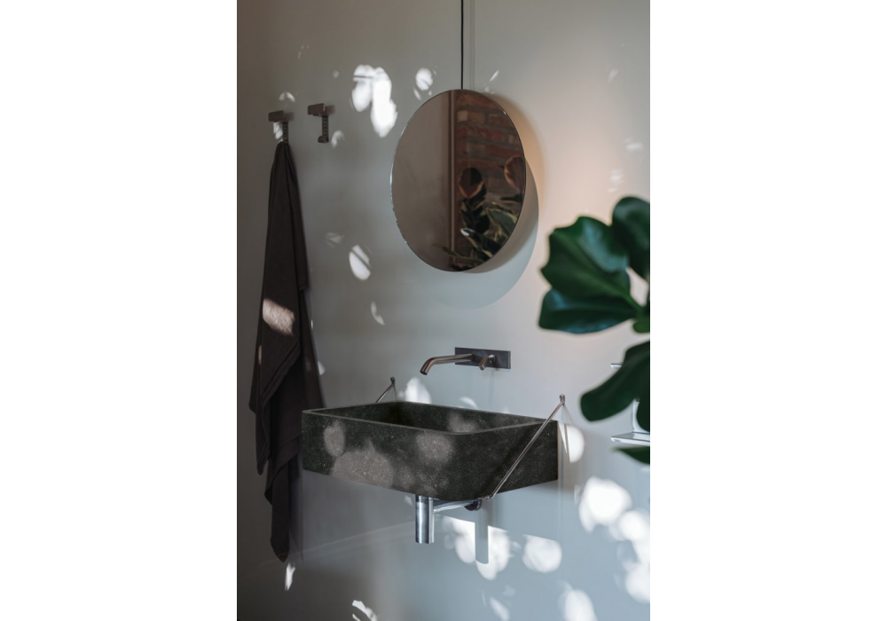 Bucatini von Fabio Bortolani & Ermanno Righi für Agape entworfen, ist ein runder Spiegel mit polierter Kante, der von einem Stahlkabel getragen und mit transparentem Kunststoffmaterial bedeckt oder an der Wand befestigt wird. Verfügbar in der Version mit oder ohne LED.