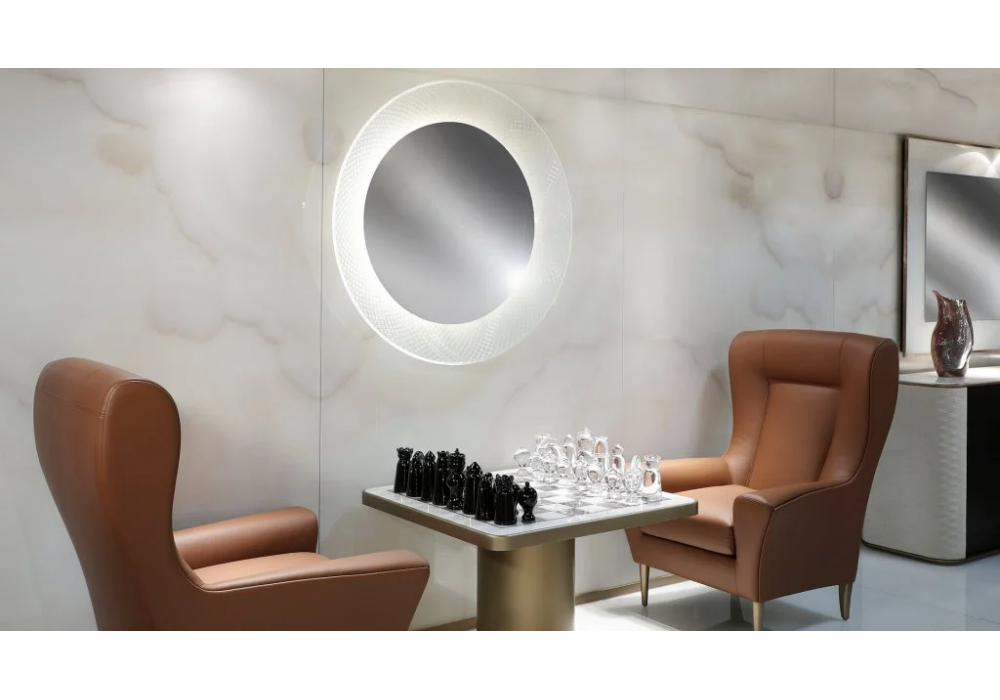 Venezia von Matteo Baroni für Reflex Angelo entworfen, ist ein Spiegel aus extraklarem Glas mit 45°-Facette. Gebogener Rahmen aus extrageätztem Glas mit Gravuren. LED-Beleuchtung.