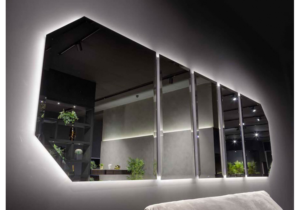 Karl Maxi von Joe Garzone für Conte Casa entworfen, ist ein Spiegel mit einer modularen Glasstruktur mit abgeschrägtem Rahmen.