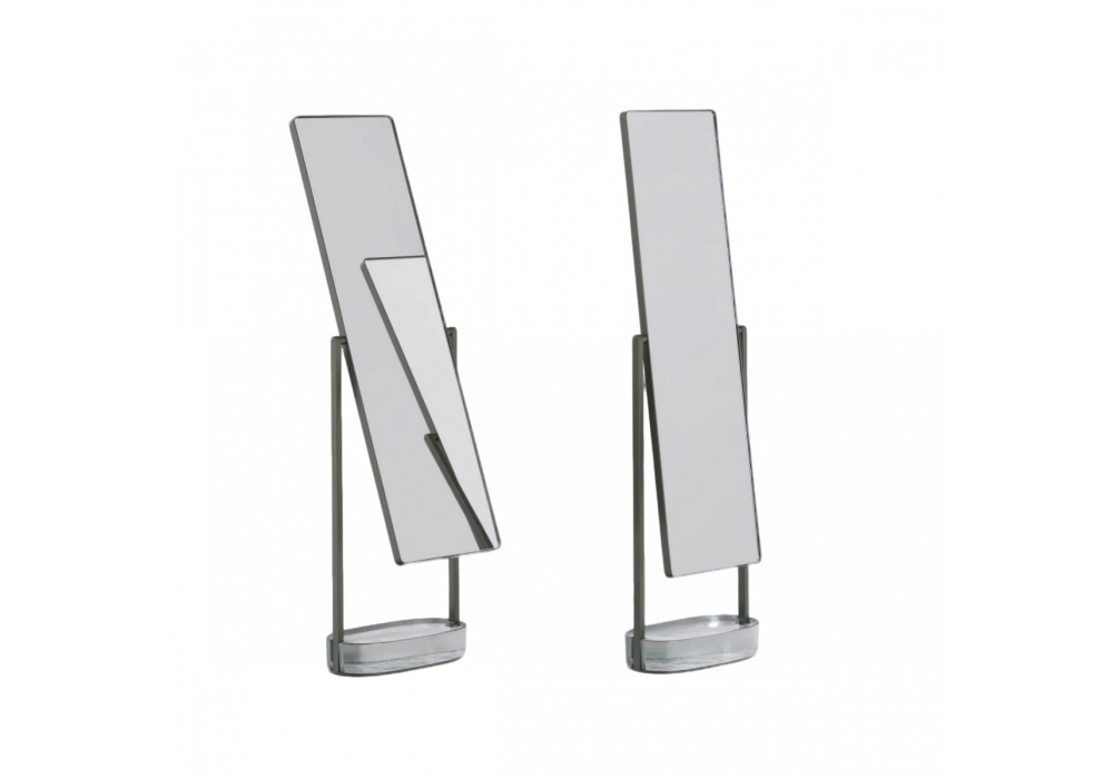 Contro Peso von Ronan Bouroullec für Glas Italia entworfen, ist ein doppelseitiger Kippspiegel mit einer Struktur aus lackiertem Stahl und einem Sockel aus einem Block aus gegossenem Kristall, der durch manuelle Versilberung verspiegelt wurde.