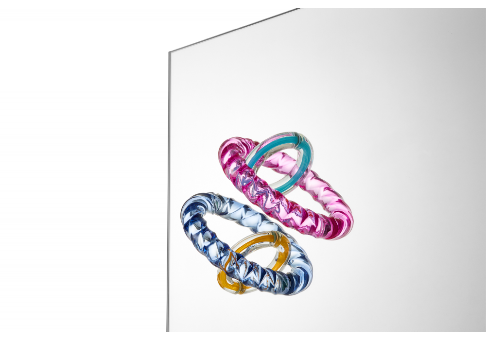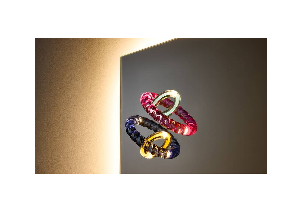 Hooptical von Bethan Laura Wood für Cassina entworfen, ist ein hinterleuchteter Spiegel mit hinterleuchteten Glasdekorationen. Dimmbares Licht.