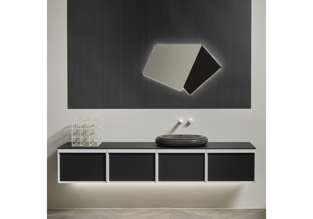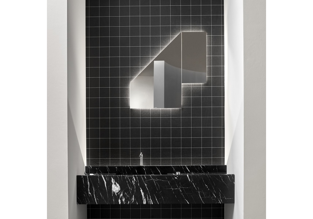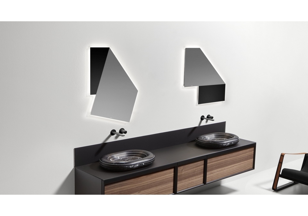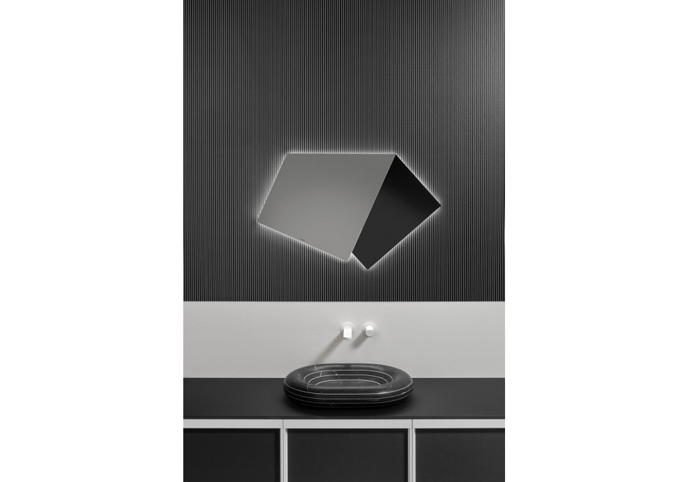 Specchidicarta von Gumdesign für Antonio Lupi entworfen, ist ein Spiegel mit polierten Kanten, weißer LED-Beleuchtung und schwarzem Rahmen. Auch mit schwarz lackiertem Einsatz erhältlich.