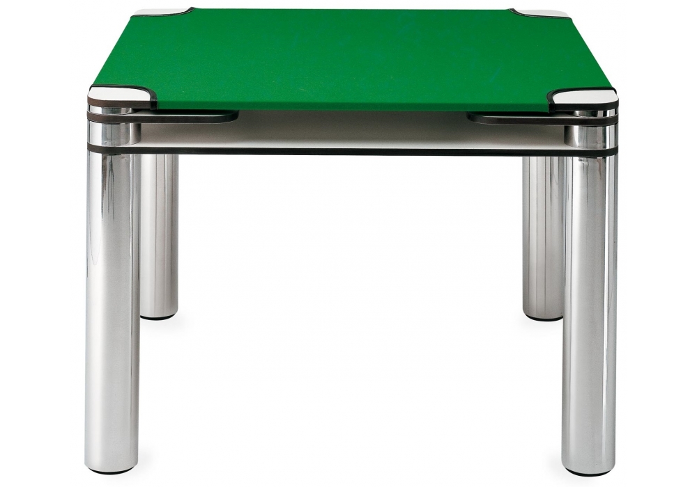 2625 Poker von Joe Colombo für Zanotta ist eine Spieltisch mit Tischplatten aus massivem Schichtpreßstoff Laminat, weißfarben. Grünes Filztuch mit Lederrand, abnehmbar. Beine aus Inox-Stahl 18/8.