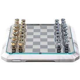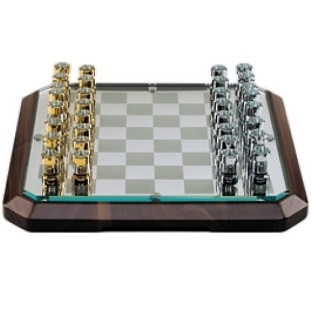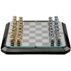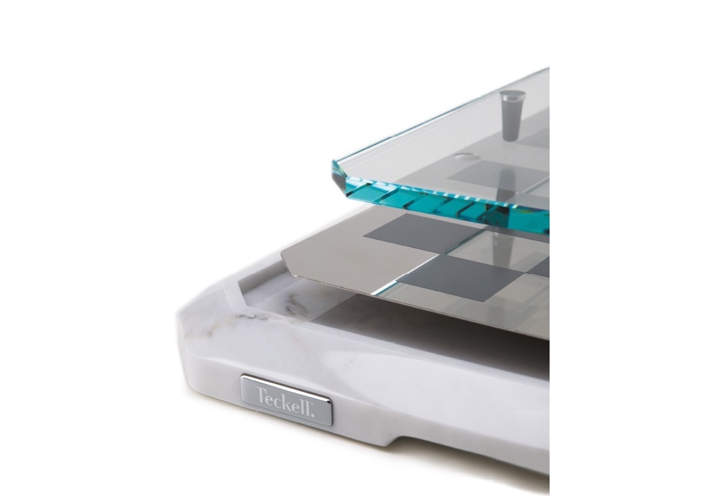 Stratego, von Lorenzo di Giovanni für Teckell entworfen, ist eine Schaakbord mit Sockel in Nussbaum oder Marmor, Spielfläche in dünnem Metall und schließlich oben in extraklarem Kristall. Die Schachfiguren sind Zylinder aus extraklarem Kristall, verziert mit verchromtem Messing / 24 Karat Gold.