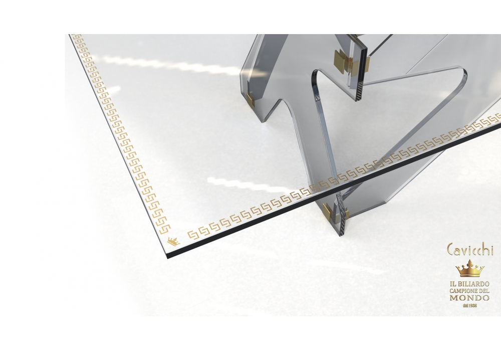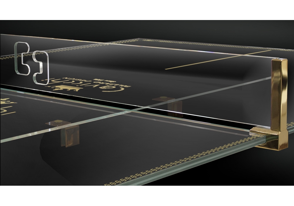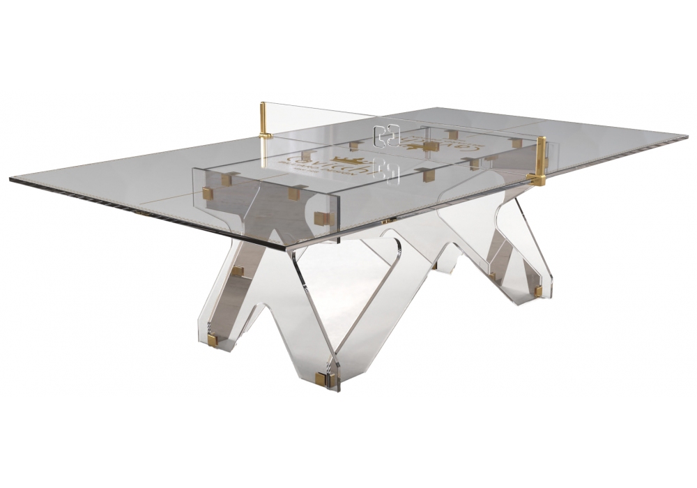 Crystal, entworfen von Cavicchi, ist eine Tischtennisplatte aus 16 mm superklarem und gehärtetem reinem Kristall, die Spielleistung mit der Möglichkeit der sofortigen Umwandlung (durch Entfernen des Netzes und der Stützen) in einen Meeting-Lunch-Tisch kombiniert, der Platz für bis zu 16 Personen bietet Menschen.