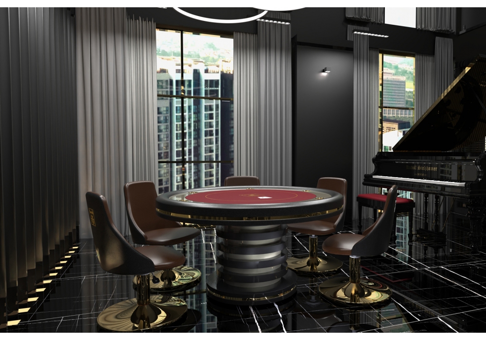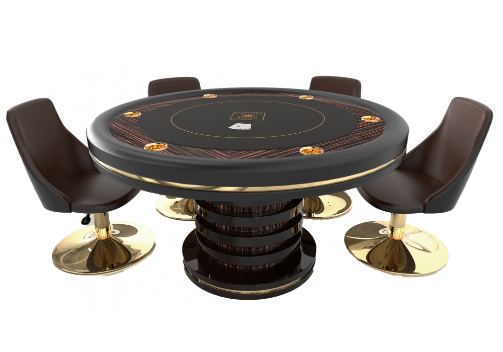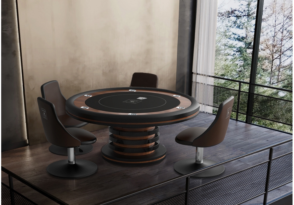 Grecale, entworfen von Cavicchi, ist ein Pokertisch, die kreisförmige Spielfläche, die am Rand vollständig ausgekleidet ist, steht auf dem raffinierten Turmsockel, auf dem sich spezielle, mit Edelhölzern und Lacken veredelte Scheiben abwechseln. Verschiedene Ausführungen auf Anfrage erhältlich.