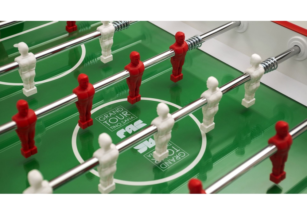 Tour '65 von Basaglia + Rota Nodari für Fas Pendenza entworfen ist ein viereckiger Fußballtisch mit einem Spielfeld aus hochfestem gehärtetem Glas. Die Möbel bestehen aus Holz, das mit farbigem Kunststofflaminat überzogen ist. Die Beine sind viereckig und in einem lackierten Metallgehäuse untergebracht. Tour '65 ist in verschiedenen Ausführungen und Schaftversionen erhältlich und wird mit 5 weißen Spielbällen geliefert.