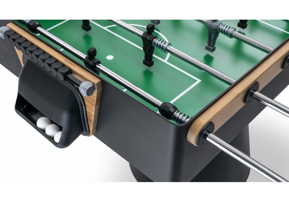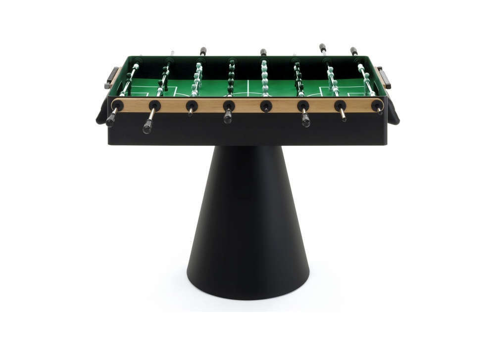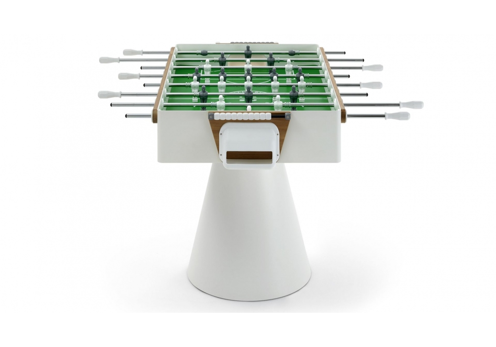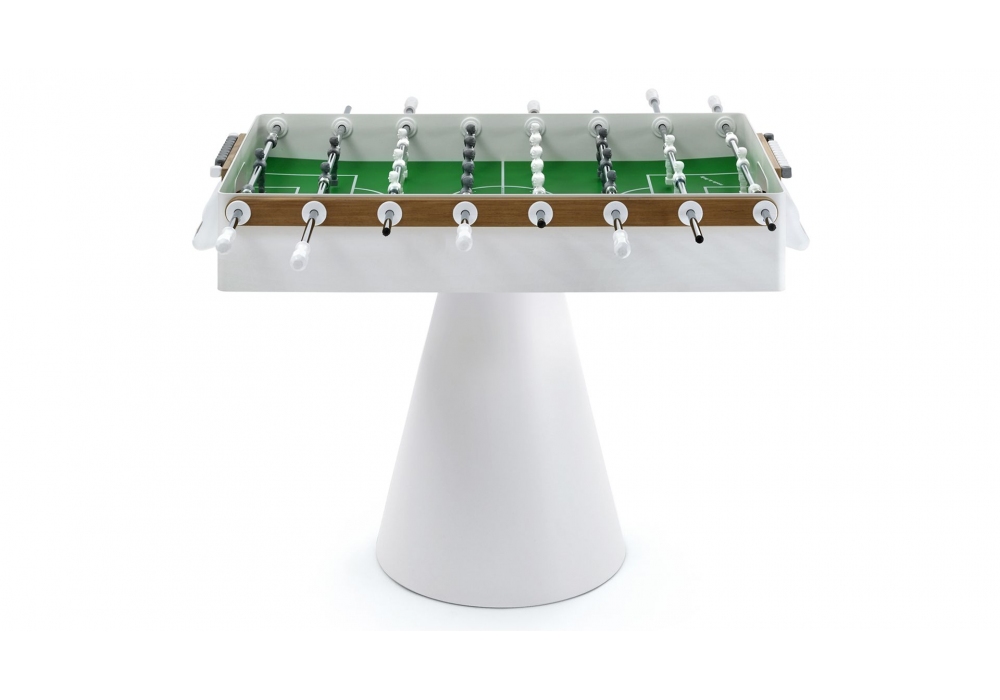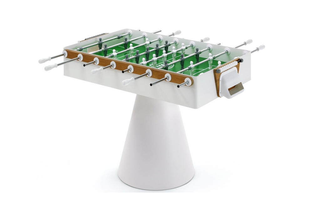 Ciclope von Basaglia + Rota Nodari für Fas Pendenza entworfen ist ein viereckiger Outdoor-Kicker mit einem Spielfeld aus geschichtetem Kunststofflaminat. Das Gehäuse besteht aus Metall mit Teakholzeinlagen. Die Basis ist konisch geformt und aus lackiertem Metall. Ciclope ist in verschiedenen Ausführungen und Schaftversionen erhältlich und wird mit 5 weißen Spielbällen geliefert.