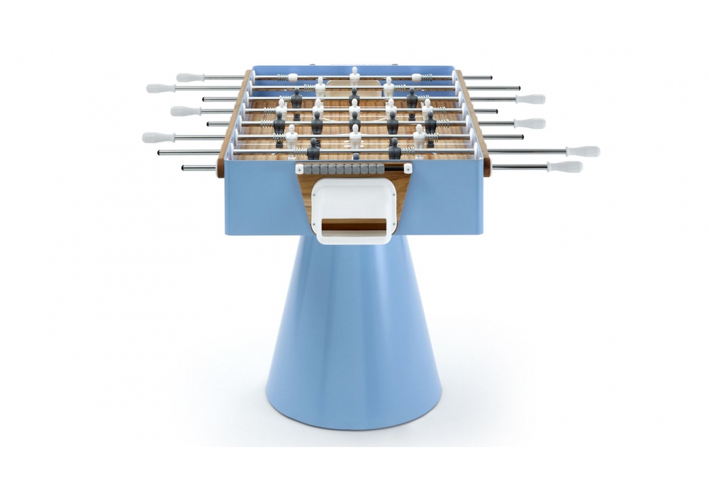 Ciclope Capri von Basaglia + Rota Nodari für Fas Pendenza entworfen ist ein viereckiger Outdoor-Kicker mit Spielfeld aus geschichtetem Kunststofflaminat. Das Gehäuse besteht aus Metall mit Teakholzeinlagen, die vollständig hellblau lackiert sind. Die Basis ist konisch geformt und besteht aus lackiertem Metall mit verstellbaren Füßen. Ciclope Capri ist in verschiedenen Stangenausführungen erhältlich und wird mit 5 weißen Spielbällen geliefert.