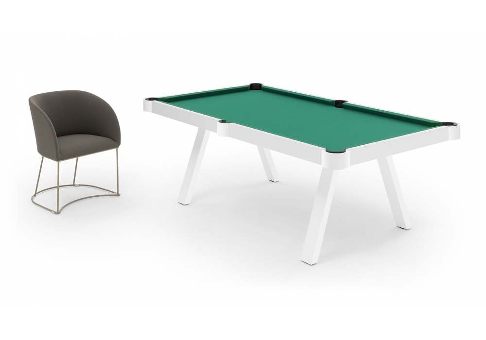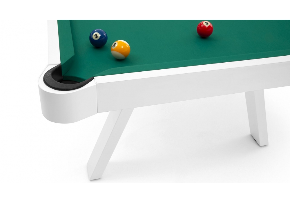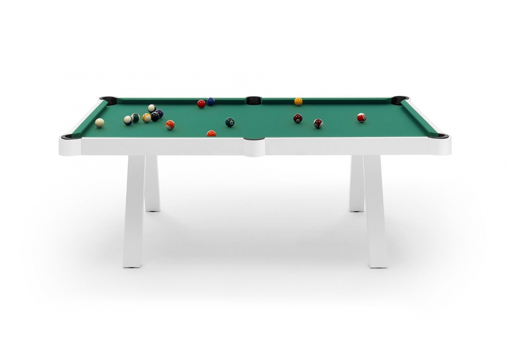Étoile von Basaglia + Rota Nodari für Fas Pendenza entworfen ist ein viereckiges Karambolagespiel mit einem Spielfeld aus einem einzigen Stück Holz. Die Struktur besteht aus Holz und Metall mit einem vierbeinigen Untergestell mit verstellbaren Füßen. Étoile ist ganz weiß lackiert und wird mit 4 Latten, einem Satz nummerierter Bälle Ø 57, einer Gipsbox, einem Dreieck für Bälle und einer Bürste geliefert.