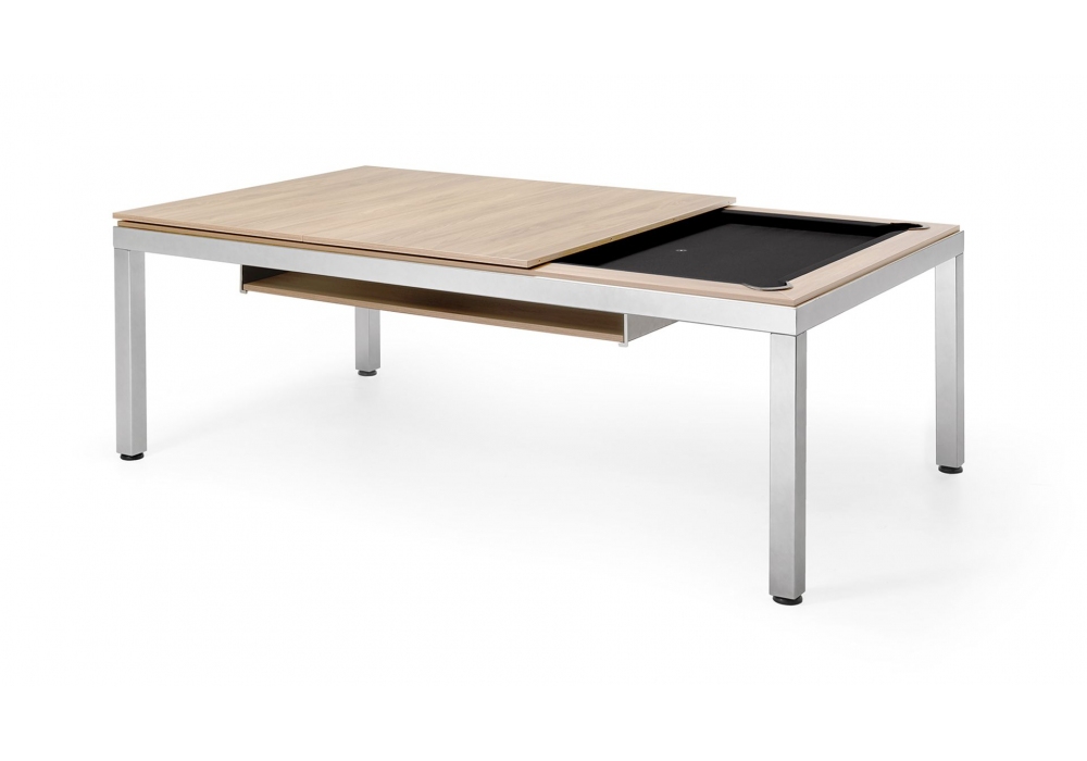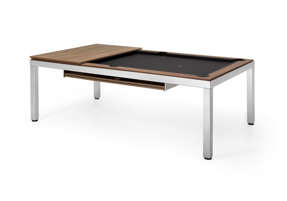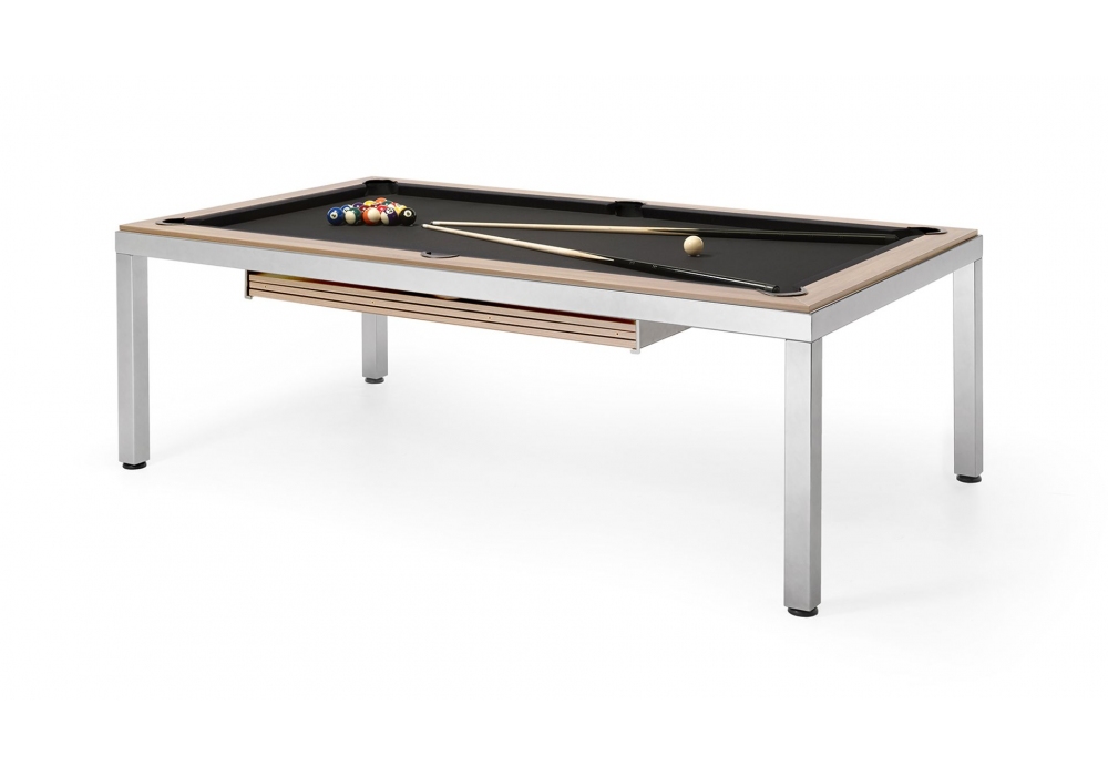 Cube von Basaglia + Rota Nodari für Fas Pendenza entworfen ist eine viereckige Karambolage mit einem Spielfeld aus einem einzigen Stück Schiefer. Die Struktur besteht aus Melamin und Metall mit einem vierbeinigen Untergestell mit verstellbaren Füßen. Cube ist in verschiedenen Ausführungen erhältlich und wird mit 4 Rippen, einem Satz nummerierter Bälle Ø 57, einer Gipsbox, einem Dreieck für Bälle und einer Bürste geliefert.